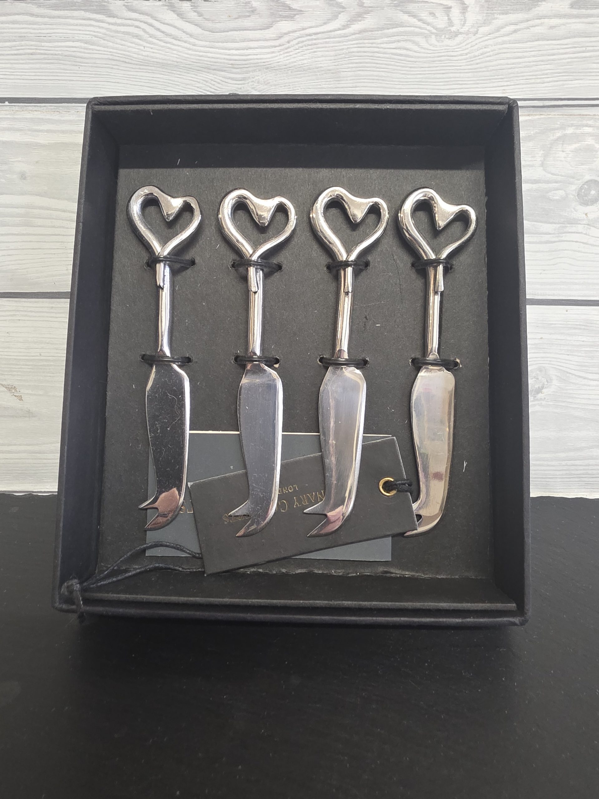 This delightful set of four miniature cheese knives, each with an “Amore” heart handle, are guaranteed to be a talking point at any meal. Their miniature size means they are ideal for giving one to each of your guests when serving a cheese board course at the end of a dinner party.